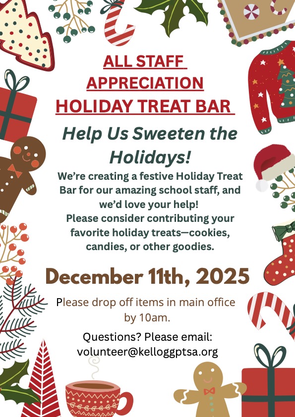 Thank you for your interest in our Teacher & Staff Appreciation efforts! If you would like to be involved with helping us make these events extra special for our teachers and staff, please email us at staff-support@kelloggptsa.org to learn what you can do! We look forward to hearing from you.